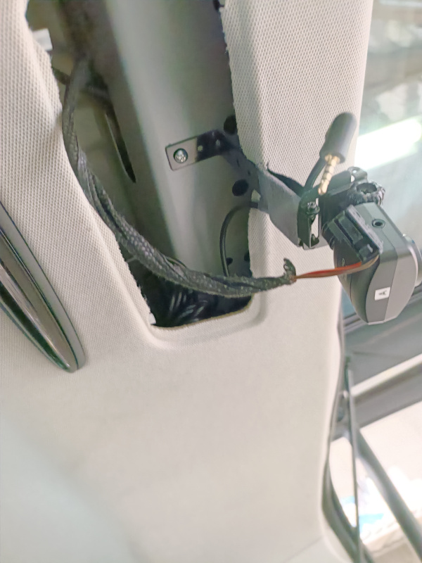 今回のVクラスは、バックドアが、ドアもガラスも開く仕様のため(ちょっとした小物を取り出したい時は、ドアではなくガラスだけを開けることができる)、バックカメラをガラスに取り付けると配線が非常に危うくなるため、このようにボディに金属ステーを取り付けてカメラを固定する、という力業で解決をします。